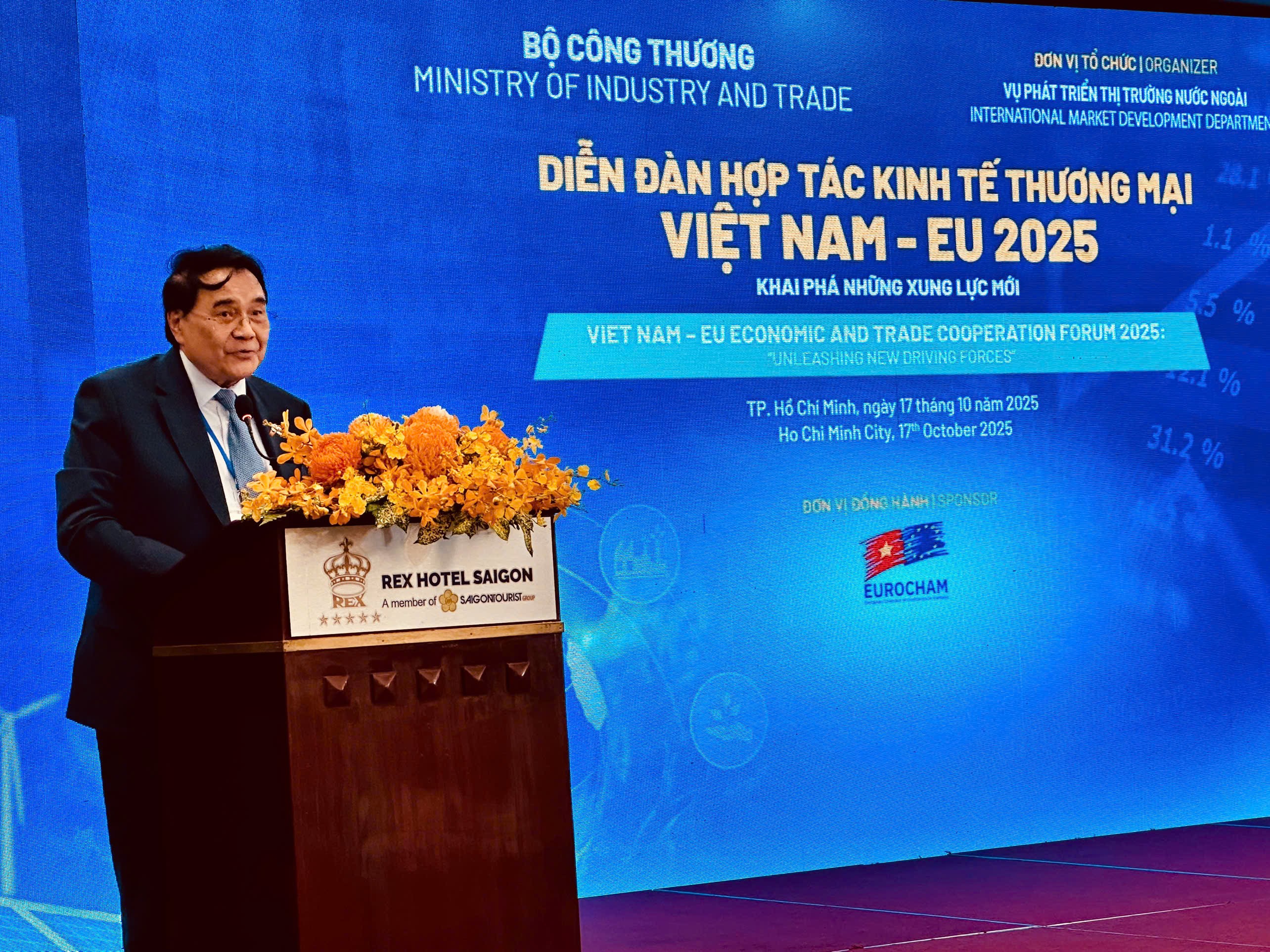 Chiều17/ 10 tại TP. HCM Bộ Công Thương phối hợp với Đại sứ quán các nước thành viên EU và Eurocham đã tổ chức Diễn đàn Hợp tác Kinh tế Thương mại Việt Nam – EU năm 2025: “Khai phá những xung lực mới” tại thành phố Hồ Chí Minh.